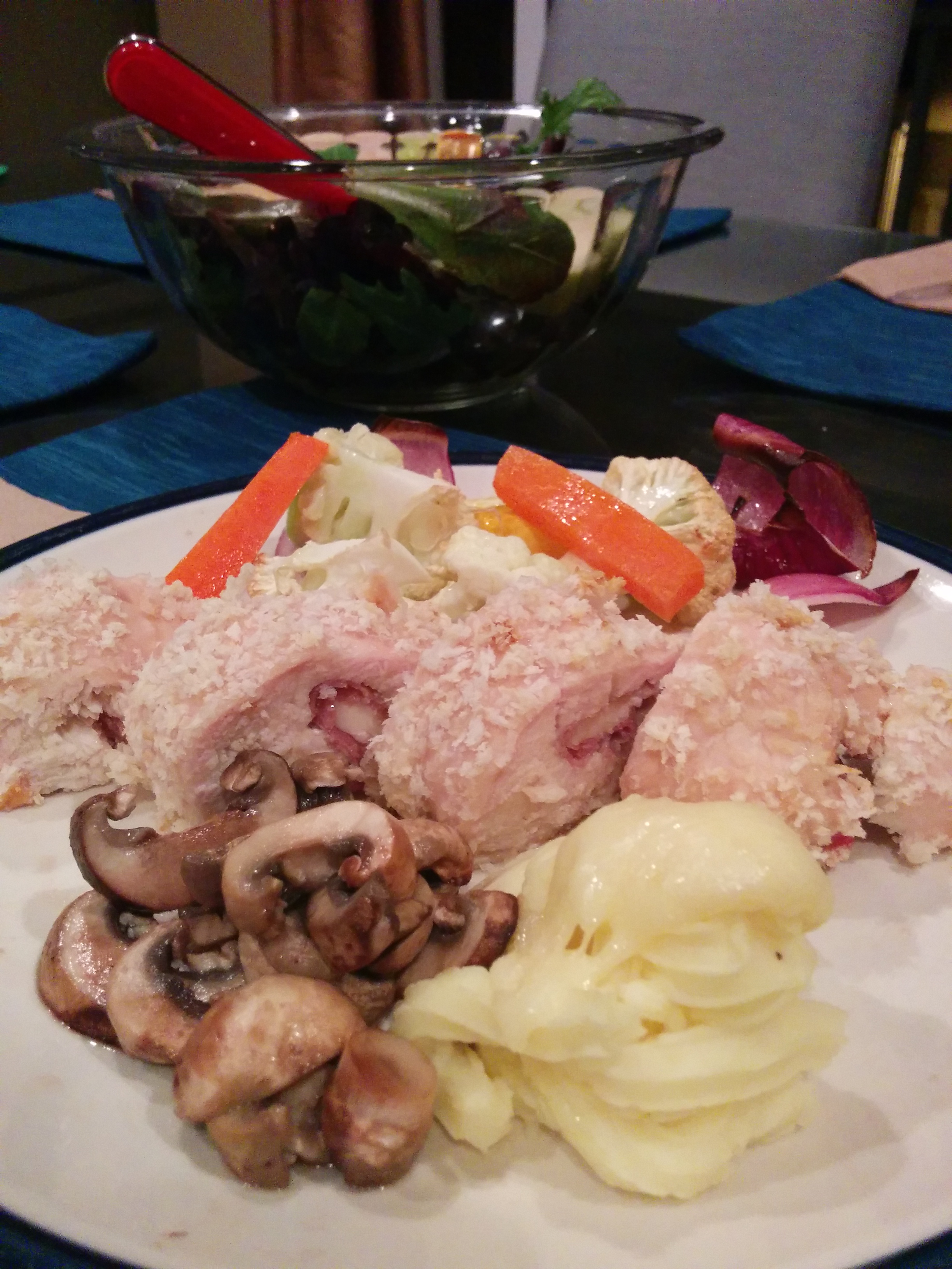 Chicken Cordon Bleu with roasted vegetables and sauteed mushrooms